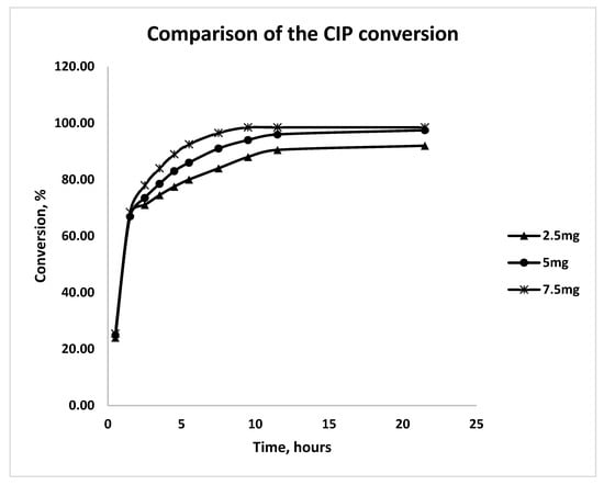 Experiments for investigating the kinetics of the reaction were conducted under the conditions: 50 mL of 20 ppm CIP solution, 0.25 mL of H2O2 and catalyst loading of 2.5 mg, 5 mg and 7.5 mg, respectively. The system was irradiated under UV light, and the lamps emitted light continuously within the range of 340–410 nm. The conversion of CIP is presented in Figure 9.