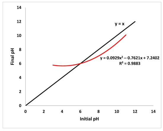 The pHpzc value of CuFe2O4/rGO/HNT is approximately 6 (the intersection of the graphs y = x and y = 0.0929x2 − 0.7621x + 7.2402). The adsorbent’s surface has a neutral charge at pH = pHpzc. Depending on whether the pH is below or above the pHpzc value, the surface of the adsorbent has a positive or negative charge. This improves its ability to adsorb anions or cations, respectively.