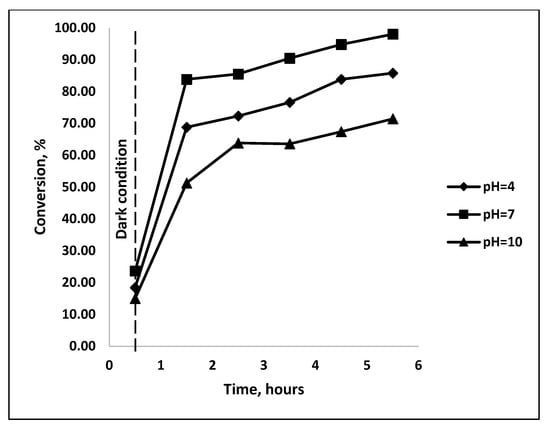 According to the data, removal of CIP increases as pH is adjusted from acidic to neutral, and it starts to fall at pH 10. The conversion of CIP at pH = 4, 7, and 10 after 5 h of UV irradiation was 86%, 98.00%, and 71%, respectively. Some inferences might be drawn from the findings found above: