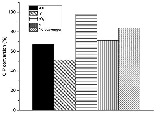 At pH = 10, electrostatic repulsion occurs and CIP degradation decreases because the photocatalyst and CIP molecule are both negatively charged. Additionally, the photocatalyst blocks UV light and lowers removal efficiency because of the considerable amount of hydroxide ions per unit volume. In a solution with a high pH, CO2 transforms into HCO3− and CO32−. These substances can eliminate hydroxyl radicals. The rate of oxidation decreases when bicarbonates convert into carbonate ions and reduce OH radical [].
