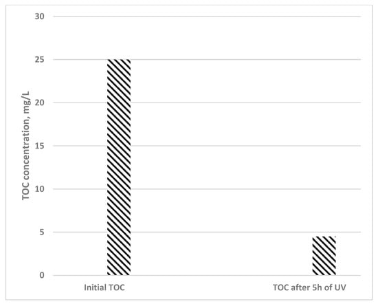 Total organic carbon (TOC) is an important parameter for assessing the quality of drinking water, wastewater, and natural water sources. High levels of TOC can indicate contamination, disinfection by-product formation, biological growth, and fouling potential. In our study, TOC was measured to determine the presence of intermediate organic compounds that were generated but not fully mineralized. Through this, we will be able to evaluate the final effectiveness of the fabricated photocatalytic material. The results are shown in Figure 14.