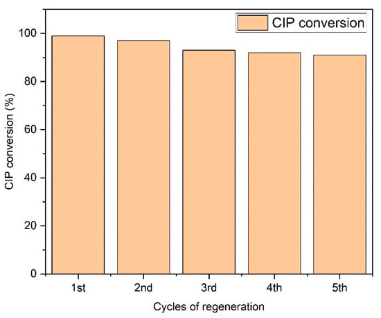 CIP conversion after five cycles of regeneration (catalyst: CuFe2O4-70%/rGO/HNT; reaction time: 5 h).