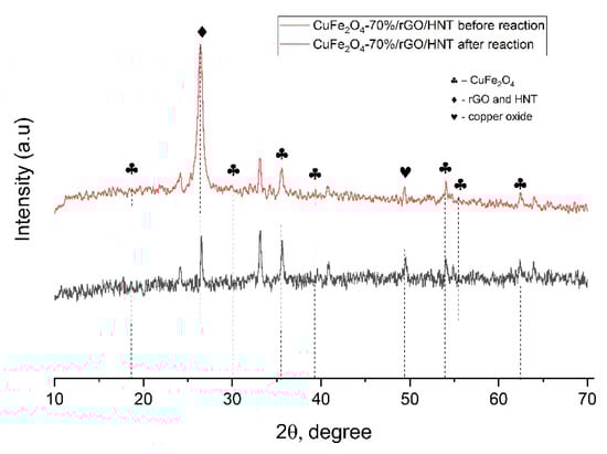 XRD spectra of CuFe2O4-70%/rGO/HNT before and after five cycles of regeneration.