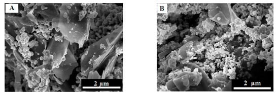 SEM images of CuFe2O4-70%/rGO/HNT before (A) and after (B) five cycles of regeneration.