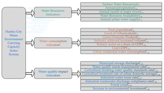 We established a corresponding index system for the carrying capacity of the urban water environment under different periods and different strategies, which reflect the scale and quality of sustainable development of the “socio-economic environment” system [31]. Based on research results from the existing sustainable development index system, we used frequency statistics, theoretical analysis, and expert consultation to select from the index systems of ecological provinces, cities, and counties. Since the water environment on earth is a complex system affected by many factors, such as soil, geography, meteorology, rivers, and vegetation, it is impossible to consider comprehensively when calculating its carrying capacity [32,33]. To scientifically standardize and guide the construction of ecological provinces, Harbin City has previously carried out the construction of ecological cities per national requirements and has comprehensive, scientific, and accurate statistics for these indicators, which can meet the requirements of the model for data. To further improve the comprehensiveness and representativeness of the index system, this paper selects relevant indexes such as per-capita GDP, industrial water repetition rate, urban domestic sewage centralized treatment rate, etc. In addition to the characteristics of the water resources, it also selects important indexes, such as urbanization level, industrial realized added value, etc. Finally, 20 kinds of items with the greatest effects on the water environment are selected as the impact indexes for the carrying capacity calculation. A system of indicators with three progressive levels is constructed. Thus, the indicators in this paper are more comprehensive, systematic, and scientific. The structure of the index system of the carrying capacity of the water environment in Harbin is detailed in Figure 1. Based on the 20 evaluation indicators, the ternary evaluation coefficients were calculated for each study object. The objective weights of the indicators were determined using the optimized PP-AHP method. A unified quantitative characterization of the positive and negative postures and levels in which the system is located was performed. Then, we analyzed the evolutionary law between the adjacent components of the ternary linkage number and used the sum of the first-order evolution values of each component adjacent to a certain component based on the first-order partial linkage number method to portray the support degree of the linkage number to each rank. In turn, we determined the ranks of the objects of study, achieved a preliminary evaluation of these, and explored the depth of evolution between the same and opposite components. The details of the evaluation level criteria used for constructing this paper are shown in Table 1. The model was then further extended using second-order partial linkage to compare with the study. The above methods were combined to evaluate and analyze the sustainability of the carrying capacity of the water environment.