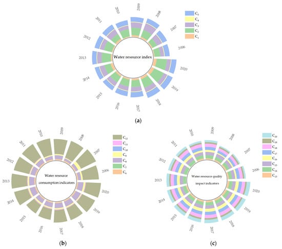 Figure 2 is a radial stacked bar chart of the specific values of the factors influencing the carrying capacity of the water environment in Harbin from 2006 to 2020. Wang et al. composed the index system for a comprehensive evaluation of the water environment carrying capacity of Daqing City based on nine main factors. We selected 20 evaluation indicators from the economic, social, resource, environmental, technical, and management fields involved in water environment carrying capacity, which makes the factors in water environment carrying capacity more complete [49].