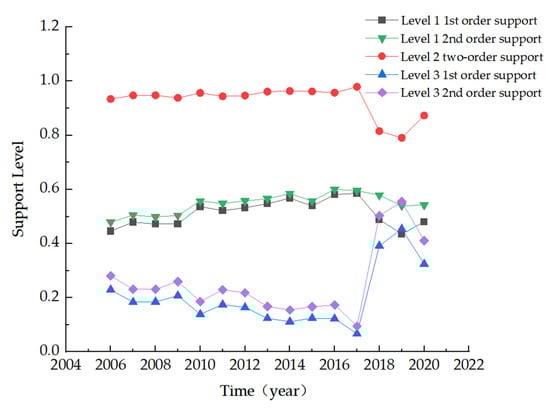 Set pair potential is used to reflect the degree of association between two sets with the same or different inverses, according to the correspondence between the set pair potential eigenvalues and rank, which effectively reflect the situation of the system and the range of rank. In the evaluation of the carrying capacity of the water environment in this paper, Level 1 corresponds to a bearable state, indicating that the city’s water environment has sufficient carrying capacity, Level 2 corresponds to a critical state, indicating that the degree of water environment utilization has reached a critical level; and Level 3 is an overload state, indicating that the carrying capacity of the water environment is close to saturation, and if this state is maintained for a long time, water shortage will occur. The bias coefficient method reveals the dynamic evolution law of the homogeneous inverse component, which can analyze the system’s state trend. The posture and degree of the system are studied according to the set pair analysis and posture analysis methods [39,40]. The support for evaluation Levels 1, 2, and 3 is inscribed using the partial coefficient of support method. The ranks are then determined according to the principle of maximum support [41].