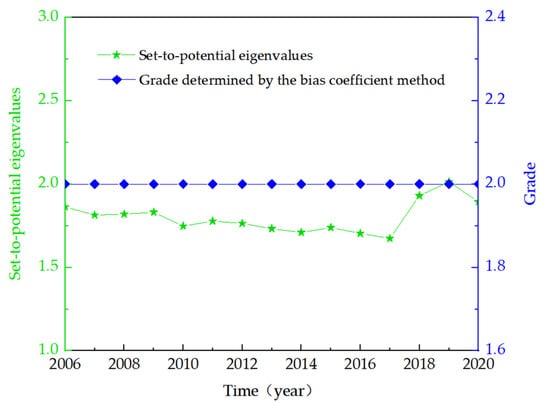 Among these, the characteristic values of the linkage set pair potential can reflect the situation of the water environment carrying capacity system in Harbin City, and, at the same time, can effectively reflect the grade range. This solves the problems of the order-of-magnitude change in a and c in the original linkage of the generalized set pair potential and the single method in dealing with the multi-grade problem of the set pair system more precisely and effectively. The physical interpretation of the set pair potential formula is enhanced at a deeper level [51]. The values of different degree coefficients and opposition degree coefficients from the linkage number are shown. Table 4 shows the set pair potential eigenvalues and the corresponding grade.