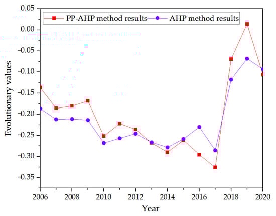 As shown in the image of the dynamic evolution of the values of the bearing capacity level in Figure 5, the PP-AHP method reported a maximum value of evolution of −0.326 and the traditional AHP method reported a maximum value of evolution of −0.285 in the three years 2016, 2017, and 2018 in this region. It can also be seen from the results in Table 4 that these three years happen to be the years of transition from partial positive Level 2 to quasi-Level 2. Apart from this, the changes between the other years are smaller than the magnitudes for these three years. The traditional AHP method shows, approximately, the same numerical trend compared with the PP-AHP method, but the evolutionary values do not float as well as the PP-AHP method optimization results. On the time axis, from 2009, the dynamic evolution of the value of the bearing capacity level showed a decreasing trend and a uniform decrease, and, in 2017, the value showed a sudden increase and was higher than the maximum value for the previous 10 years. After that, the dynamic evolution of the value for the horizontal bearing capacity fluctuates around −0.05 and gradually changes to the normal level. The bearing capacity level shows a rapid turning trend. The sudden change in water-carrying capacity from 2017 to 2019 is due to the “Heilongjiang Province Water Pollution Prevention and Control Work Program” issued by Heilongjiang Province in 2016, which was implemented by Harbin City with an emphasis on vigorously addressing water quality issues, coordinating the control of sewage discharge and sewage treatment, and increasing environmental protection input costs. The results of the optimized weights also show that C14, C15, C17, and C18, which have a larger weight in water quality impact indicators, have been significantly improved.