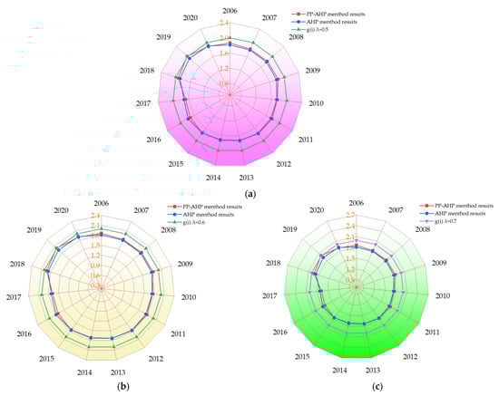A comparison of the AHP method, PP-AHP method, and confidence level judging method; (a–c) are radar plots of the results of the confidence level judging method, compared with the results of the two weighting methods, when the confidence levels are taken to be λ = 0.5, λ = 0.6 and λ = 0.7.