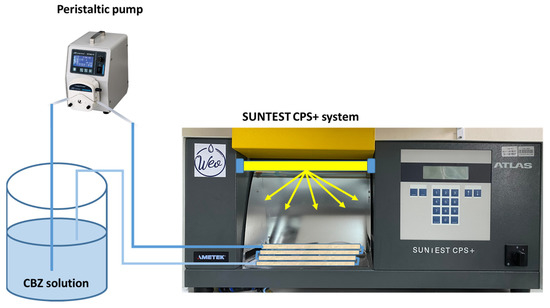 A 40 g photocatalyst (TiO2) was packed in 4 × 20 cm Pyrex glass tubes (inner diameter: 1 cm). The reaction tubes were installed in the simulated sunlight reactor (model SUNTEST CPS+, Atlas Material Testing Technology LLC, Mt Prospect, IL, USA) equipped with a 400 W/m2 irradiated xenon lamp in the 300–800 nm range (Figure 1). The total energy dosage that was recorded by the SUNTEST CPS+ system was 21.56 kJ for 6 h of irradiation. The simulated light system was also installed with a daylight filter to limit the radiation under 290 nm (UV special glass, code: 56052371 UV). One liter of 5 mg L−1 CBZ (variable conditions) with various environmental factors such as pH, humic acid (HA), anions, and cations was circulated through the degradation system at a rate of 50 mL min−1 for 6 h. The CBZ solution was circulated through a photocatalyst (TiO2) for 30 min in the dark to reach an adsorption/desorption equilibrium. Then, the solution was irradiated, and samples were taken out every 30 min to analyze the removal efficiency of CBZ. All experiments were conducted at room temperature and the reactor was set at 25 °C.