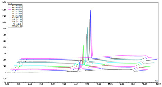 At the beginning of the experiment, only the peak of BBZ was observed before the light was turned on (Figure 6). Then, the peak area of CBZ decreased dramatically and new lower peaks appeared, confirming an efficient degradation of CBZ and the formation of by-products. The retention time of CBZ was determined at 7.737 min, while the retention time of the by-products was detected at 1.157, 1.694, 6.568, 7.037, and 10.55 min. This was illustrated in the mechanism (Figure 6) and detected by MS (mass spectrometry).
