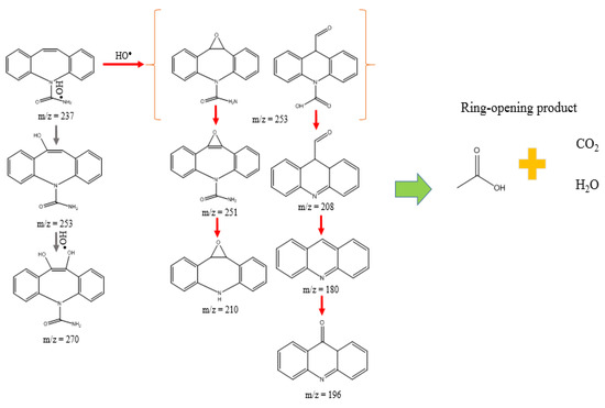 The mechanism of the by-product formation is shown in Figure 7 and is hereafter discussed in comparison to the literature. During the photodegradation process of CBZ, there are two main pathways. First, (Phenytoin) is formed by the hydration of CBZ (m/z = 253 = 237 + 16) [9]. The by-product at m/z = 251 could be the predominant secondary degradation by-product generated from 10, 11-epoxycarbamazepine due to the intramolecular reaction [12]. In addition, the by-product at m/z = 251 was oxidized to form a by-product at m/z = 210. After that, the epoxy bond of 10, 11-epoxy carbamazepine was attacked by two h+ or O2●− radicals, which led to the appearance of 10-1(1aminovinyl)-10,10a-dihydroacridine-9-carbaldehyde, but there was also intramolecular transformation, so the molecular weight could not change [25]. Then, the by-product at m/z = 208 was produced as the ring contraction combined with the reduction (-CONH2) of (1,1(1-aminovinyl)-10, 10a-dihydroacridine-9-carbaldehyde) and was oxidized again to form acridine (180) and acridone (196) [12]. Another means of by-product production is the formation of 10-hydroxy carbamazepine by the attack of HO● to the olefin bond in the carbamazepine ring, which could be constructed into 10,11-dihydro-10,11-dihydroxycarbamazepine when this bond interacts with HO● groups again. Finally, the above by-products undergo another ring-opening reaction and the product detected is acetic acid (m/z = 60), which can be mineralized to CO2 and H2O via oxidation. Combined with the TOC removal efficiency (71.27%), this demonstrates that most of the by-products can be removed into small inorganic molecules by the TiO2 photocatalyst. Some other by-products, such as acridont-hydroxide (m/z = 226), 3-hydroxybenzoic acid (m/z = 137), and by-products at m/z = 115, were found [12,37], but in this study, signals with these masses were not detected.