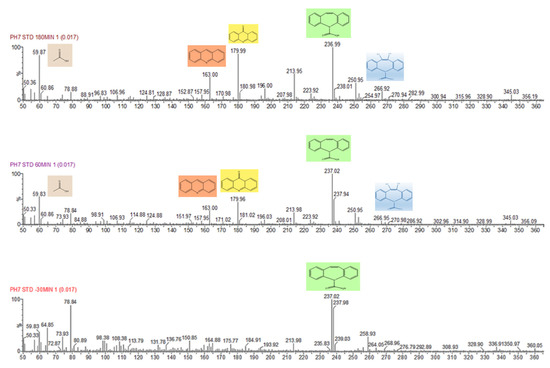 As shown in Figure 8, the peak intensity of CBZ and other by-products was obtained at different masses. Specifically, in the initial condition (t = −30 min), the peak at m/z = 237 was the dominant peak with the highest signal. After 60 or 180 min of degradation, some by-products appeared as revealed by new mass peaks at m/z equal to 60, 180, 196, and 270. The name, formula, and structure of the by-products are shown in Table 2.