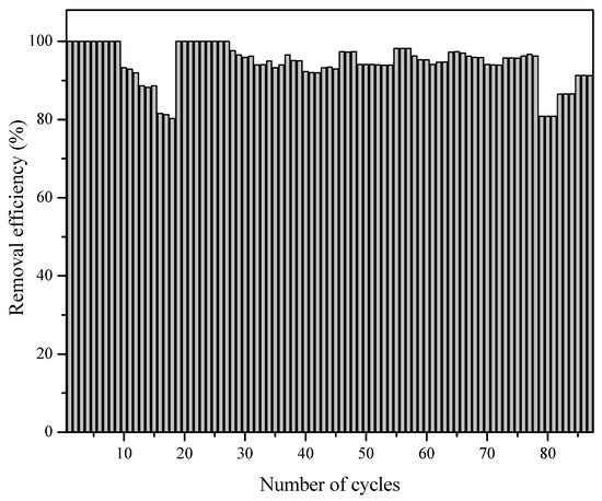 The resulting composites were designed mainly to allow their easy separation after the process [5]. After about 90 cycles, the degradation efficiency in the subsequent process experienced a slight decrease under the same condition as the initial one (ultrapure water, pH = 7). This value decreased from 100% after 360 min to 91.26% with a decrease in the mass of the TiO2 photocatalyst of about 5% (from 41 g to 39 g). It is clear that TiO2 in the ceramic form is extraordinarily stable and that the catalyst was occasionally chipped and flushed from the system. The photocatalytic activity can be regenerated by washing with HCl 1 M. The washing step was performed by cycling with HCl 1 M for 30 min to eliminate the impurity sticking on the surface of the material, and then rinsing again with 1 L of ultrapure water [31]. Even though this led to a small decrease, the photocatalyst was purified and its activity also stabilized (Figure 9). In addition, the morphology of the surface of PFS-01 before and after the experiment was observed by a scanning electron microscope (SEM), and there was no change in the morphology of the surface (Figure S1). The XRD results (Figure S2) showed a mixture of anatase, brookite, and rutile forms in the material and the XRD spectrums are similar for the material before and after the experiment.