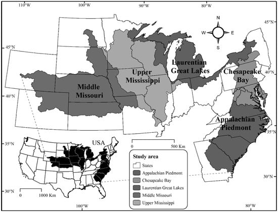 Five freshwater ecoregions of the United States that comprised the study area [37].