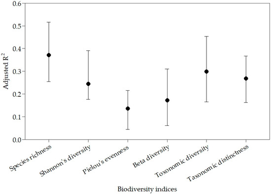 All biodiversity indices were significantly predicted by at least two landscape variables in linear regression models. Adjusted R2 ranged from 0.52 for species richness in the Upper Mississippi ecoregions to 0.04 for Pielou’s evenness in the Appalachian Piedmont (Table 4). All natural landscape variables and anthropogenic land use variables selected as predictor for inclusion into models were significant (p ≤ 0.01), and their variance inflation factors (VIF) were low (i.e., maximum VIF = 6.4) for all the best models across all five study ecoregions. The low VIF values equal to or below 6.4 for all selected predictor variables indicated that there was low collinearity between variables selected in the best models predicting biodiversity indices [74]. Biodiversity indices were variably predicted across ecoregions described by the variance in adjusted R2 values from linear regression models (Table 4). Species richness was the best predicted biodiversity index in four out of five ecoregions with beta diversity being better predicted in the Appalachian Piedmont ecoregion (Table 4). Taxonomic diversity and distinctness biodiversity indices were the best predicted in the Chesapeake Bay ecoregion with adjusted R2 = 0.37 (Table 4). The best predicted index on average across all study ecoregions was species richness with a mean adjusted R2 = 0.37 (Figure 2). The second best predicted index on average across the study ecoregions was a taxonomic diversity with a mean adjusted R2 = 0.27 (Figure 2), while the least predicted biodiversity index on average was Pielou’s evenness across study ecoregions with a mean adjusted R2 = 0.14 (Figure 2).