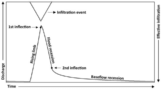 A graphical representation of spring hydrograph components. The first inflection point shows the maximum infiltration state, and the second inflection point represents the end of the infiltration event [13].