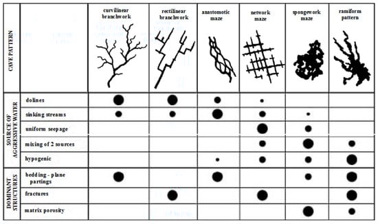 Common patterns of dissolution conduits in carbonate rocks. The size of the black circles shows the relative abundance of cave types in each of the listed categories [25].