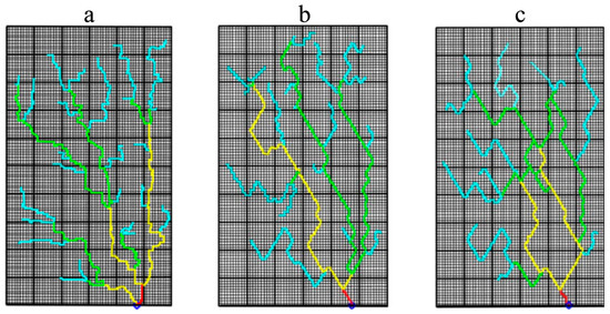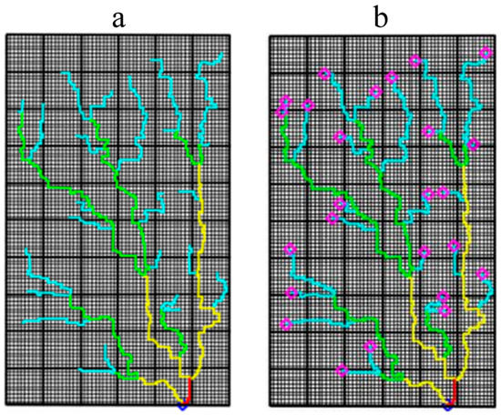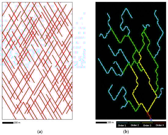 A network conduit pattern (Figure 4b) was generated with the following steps: (1) a two-dimensional joint set (Figure 4a) was randomly generated using the ADFNE1.5 code (MATLAB code S2) [40], and (2) one seed cell (as a spring) is defined in the lower boundary, and the conduit growth starts from the seed location and continues along the joints. The neighbors that can be attacked are a maximum of three; for a new cell to be attacked, its neighbors do not need to be unoccupied. Such conditions enable the formation of loops in the conduit network because a cell can be attacked from different paths. Where the conduit network’s growth reaches the joint intersection, it continues in shorter paths first, and (3) the conduit network was ranked using the algorithm proposed by Gleyzer et al. [41]. This algorithm allows a conduit to split into several downstream conduits, which can be reconnected at one point. The loops with the greatest distance from the starting point of the network (seed cell) are ranked first, and the order of conduits increases if independent tributaries join together [41].