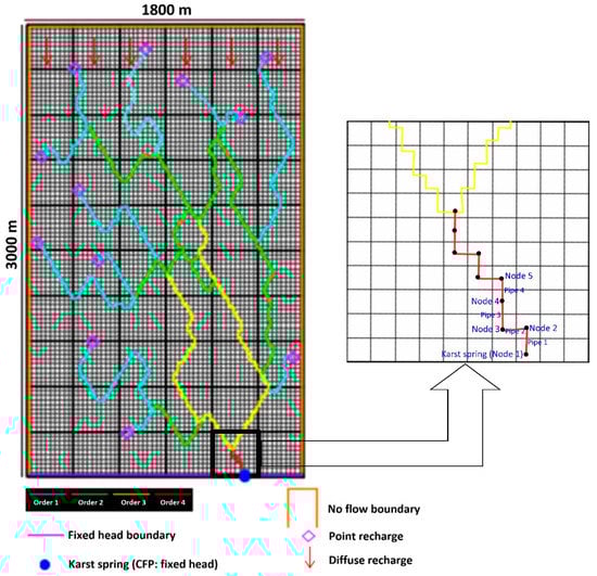 A numerical model using MODFLOW-CFP [43] was set up based on the assumed synthetic karst model (Figure 6). A period of 120 h with a time step of 1 h was assumed for simulating flow and producing the spring hydrograph.