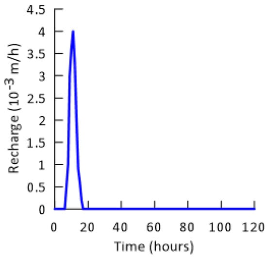 The entire model domain is supplied with constant diffuse recharge of m/h. Additionally, the diffuse recharge caused by a multi-hour precipitation event was applied to all model cells (Figure 7). Moreover, in a few scenarios (Section 2.3), part of recharge is applied directly to the conduits through sinkholes as point recharge.