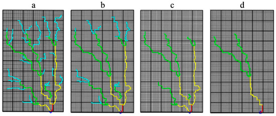 Curvilinear branchwork patterns with different conduit densities in scenario B. (a–d) represent the base curvilinear branchwork model, with 25%, 50%, and 75% reduction in the length of conduits, respectively. Rectilinear branchwork and network maze patterns with different conduit densities in scenario B can be found in the Supplementary Materials (Figures S1 and S2, respectively).
