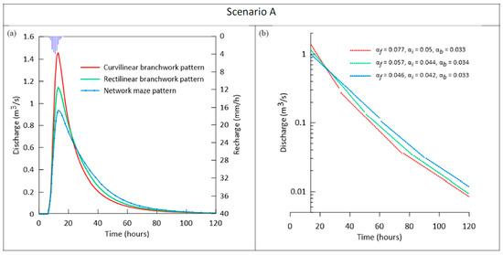 (a) The spring hydrographs were obtained from the different conduit network patterns in diffuse recharge (scenario A). (b) Recession curves (, and are the fast flow, intermediate flow, and baseflow recession coefficients, respectively). The blue lines at top of graph (a) indicate recharge.