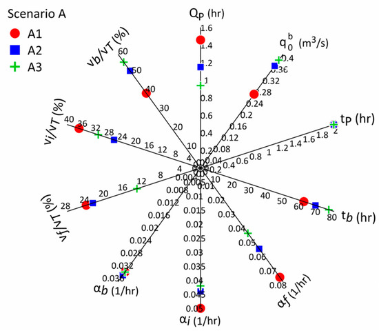 To compare the hydrographs obtained from modeling in each scenario, the parameters of peak discharge , the lag time between the peaks of recharge and discharge , baseflow discharge , the return time to baseflow discharge , the fast-flow recession coefficient , the intermediate recession coefficient , the baseflow recession coefficient , the fast flow volume , the intermediate flow volume , and the baseflow volume from the spring hydrograph curve were extracted and evaluated (Figure 11).