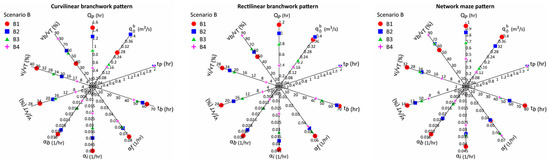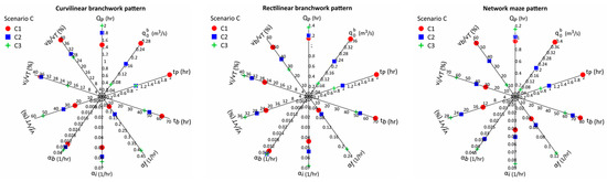 In order to assess the effect of conduit patterns in scenario A, three models that differ only in their conduit patterns are compared. The modeling results show that changes under the influence of the pattern of conduits. The increase in is attributed to the relatively larger diameter of the conduits close to the spring and the higher degree of conduit connections in the branchwork patterns compared to the network pattern. Since the rising limb of the hydrograph curve is more affected by the recharge condition [53,54], and in scenario A, the type and amount of recharge was assumed to be the same for all three models, is similar for different patterns of conduits (Figure 12 and Figure 13; Table S1). However, and are different in the three models, indicating the slower water transfer in the maze pattern than in the branched patterns (Figure 12 and Figure 13; Table S1).