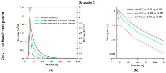 Although the recession coefficient depends on a reservoir’s permeability, storage, and geometric properties [55], scenario A was designed to assess the effect of conduit pattern only. Since represents the most rapid drainage of the karst network by the largest conduits [47], a larger value of 0.077 is estimated for the branchwork conduit pattern compared to 0.046 in the network pattern. However, is almost similar in three assumed conduit patterns (Figure 12b and Figure 13; Table S1). Assigning similar aquifer characteristics (such as aquifer shape, hydraulic conductivity, storage coefficient, and boundary conditions) for models in scenario A caused similar for three models. Theoretically, the baseflow recession coefficient () depends on not only the hydraulic properties of the low hydraulic conductivity volumes but also the area and form of the whole aquifer geometry, the hydraulic conductivity, and the density of the conduit network with high hydraulic conductivity [11]. Results of scenario A suggest no considerable effect of the conduit patterns on .