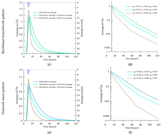 (a,c,e) The spring hydrographs were obtained from curvilinear branchwork, rectilinear branchwork, and network maze patterns under different recharge types (scenario C). (b,d,f) Recession curves (, and are the fast flow, intermediate flow, and baseflow recession coefficients, respectively). The blue lines at top of graphs indicate recharge.