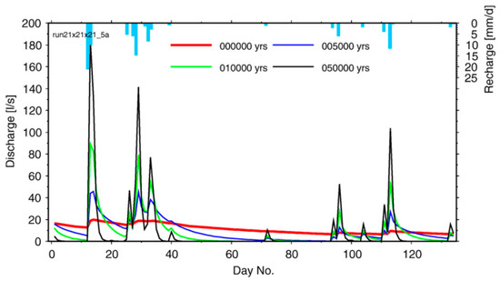 Short-term spring response in the stationary model: recharge and discharge time series for different evolution times. Yrs is the abbreviation of years. For example, 005000 yrs shows the evolution of channels after this time. Run21 × 21 × 21_5a shows the model domain that is discretized into 21 × 21 × 21 nodal points. 5a indicates the fifth uplift of the basin [58].