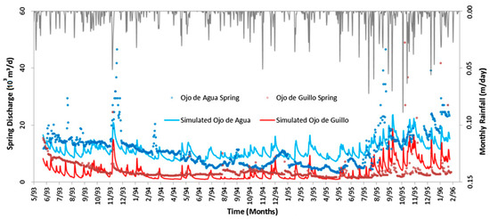 A comparison of the daily rainfall hydrograph with the daily mean discharge hydrograph, both simulated and observed, for the Oje de Agua spring in Vega Baja and the Oje de Guillo spring in Manati between June 1993 and February 1996 [3].