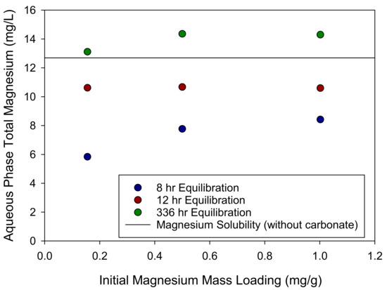 The fractionation of the magnesium mass in the reactors with a mass loading of 0.1% MgO (wt.%) and contacted for 336 h (14 day) was found to be 0.81 ± 0.08 (standard deviation of triplicate reactors) in the oil, 0.06 ± 0.01 in the aqueous phase and 0.13 ± 0.02 of mass associated with the interfacial mixture (see the Fractionation Calculation Section in the Supplementary Materials for details). Additionally, the total concentrations of Mg associated with the aqueous phase ranged between 6 mg/L and 15 mg/L, with a greater mass loading and longer equilibration time producing higher concentrations (Figure 1). The aqueous solubility of Mg in these systems was estimated to be 12.7 mg/L using PHREEQC, where the particle solid was brucite (MgOH)2 [31].