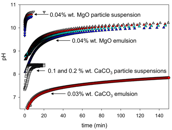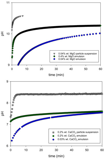 Illustrative pH rebound curves measured after HCl acid addition from particle suspensions and emulsions with varying mass loadings for (top) MgO and (bottom) CaCO3. Note that the temporal resolution of the data gives the illusion of a line, but all information shown in this figure is in the form of discrete measurements.