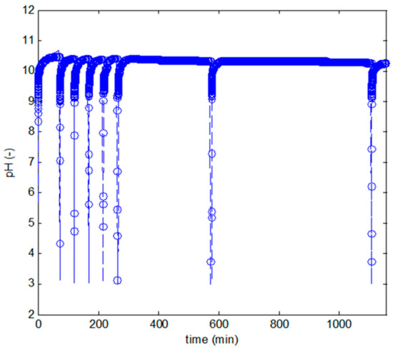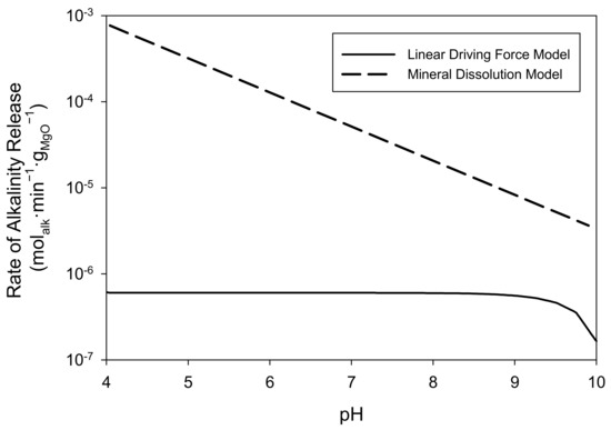 represents the change in the solid particle mass per time. The curly brackets in Equations (8) and (9) denote activity. The solubility product of MgO, Ksp,MgO in Equation (9) is defined in Equation (7), based on the dissolution reaction shown in Equation (6), and set to a value of 5.012 × 10−11. Note that the rate law developed by Fedoroĉková and Raschman (2008) [33] is based upon the reaction as shown in Equation (10), and the way the reaction is written matters when considering the reported value of Ksp,MgO. That is, the Ksp,MgO for the reaction shown in Equation (6) was the product of the Ksp,MgO for the reaction shown in Equation (10), and the square of the water dissociation constant (i.e., Kw2). In Equation (8), k is the rate coefficient, which was set to 7.97 × 10−5 mol·m−2·s−1, based on the work of Fedoroĉková and Raschman (2008) [33]. The particles were assumed to be a uniform distribution of shrinking spheres for the purposes of calculating the total surface area (TSA) in the application of the rate expression. The MgO dissolution model was, therefore, fully parameterized using information independent from the research presented herein. All simulations conducted to describe the temporal release of alkalinity and the related pH response were performed in MATLAB R2014a (MathWorks, Natick, MA, USA). Additional information is provided in the Modeling Approach Section in the Supplementary Materials.