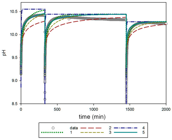 Simulations conducted to explore the possible influence of particles not encapsulated within the oil droplets of an emulsion containing 0.1% wt. MgO. Measured pH is shown as the grey open circles. Note that the temporal resolution of discrete pH measurements gave the illusion of a line. The lumped mass transfer coefficient, kL, was fit to a series of hypothetical fractions of unencapsulated particles, f,fast. Simulations: (1—dashed line) f,fast = 0.05 produced a best fit kL of 6.1 × 10−5 min−1; (2—medium dashed line) f,fast = 0.00025 produced a best fit kL of kL = 6.0 × 10−5 min−1; (3—short dashed line) f,fast = 0.025 produced a best fit kL of 6.0 × 10−5 min−1; (4—dot and dashed line) f,fast = 0.99 produced a best fit kL of 6.0 × 10−6 min−1; and (5—solid line) f,fast = 0 produced a best fit kL of 2.7 × 10−4 min−1 and. All models were run with kdiss = 1.2 × 10−3 min−1 and Ksp,MgO = 5.01 × 10−11.