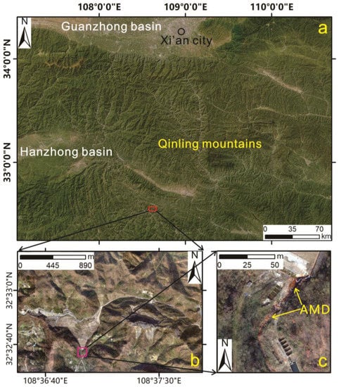 (a) Location of the stone coal mining area; (b) UAV image of the study area; (c) the Xiaomi stream polluted by AMD.