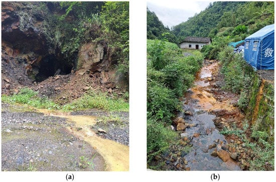 (a) The AMD flows out of the mine portal; (b) the Xiaomi stream polluted by AMD.