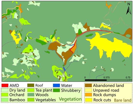 This study collected the latest land-use map of the study area from Xi’an Geological Survey Center of China Geological Survey, and combined similar land types according to recent land cover. Since dry land, tea plant, shrubbery, orchard, woods, bamboo, and vegetables are all vegetation types, and abandoned land, unpaved road, rock dumps, and rock cuts are bare-ground types, a total of five land-cover types were displayed. The five surface-cover types of mine acid drainage, water body, roof, vegetation, and bare land are most accurately classified as the ground truth data (Figure 4).