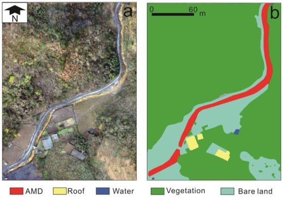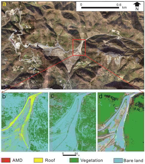 Meanwhile, due to the limitation of flight time and spectrum of the RGB images collected using UAVs, non-paved roads, open pits, and waste dumps of stone coal mines all belong to mining land. The color and texture of these cover types are similar to those of natural bare land, which results in failure to classify these similar land-cover types by machine-learning algorithm. However, along the pathway of AMD, the water bottom exhibited orange color due to the deposition of richer iron oxides on the water bottom. This color can be distinguished from most other objects and clean water bodies. Only some dry vegetation in autumn and winter show brown-red color which leads to incorrect classification of AMD identification. Therefore, follow-up research should consider the use of growing season images to refine other land-cover classifications for in-depth learning fine classification.