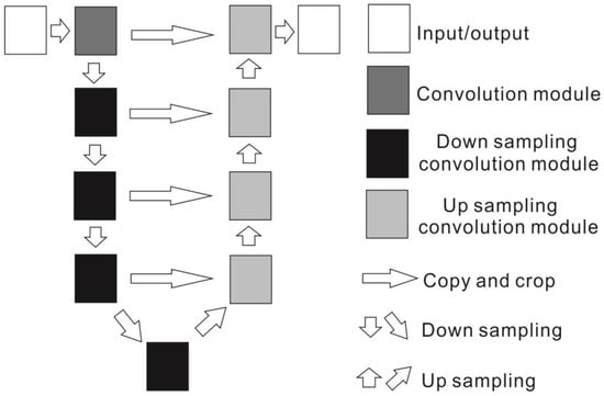 The U-Net network structure, proposed by Olaf Ronneberger, Philipp Fischer, and Thomas Brox at the IEEE International Symposium on Biomedical Imaging (ISBI) Competition 2015, is a U-shaped structure consisting of shrinking subnetworks and expanding subnetworks. Therefore it is named U-Net []. The structure of the U-Net network is shown in Figure 6. U-Net first extracts feature information by downsampling through convolution and pooling, and then fuses lower feature maps before upsampling and clipping through transposed convolution for accurate positioning. The U-Net method repeats this process until the output signature map is obtained, and then the segmented map is finished through the activation function.