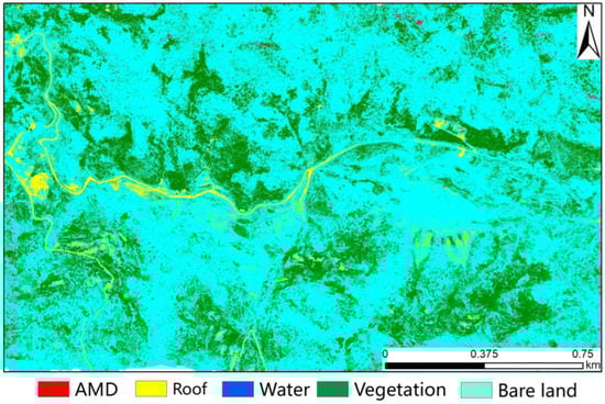 In this study, the confusion matrix method was used to evaluate the accuracies of AMD and land-cover classification in this mining area. The confusion matrix is calculated by comparing the location and category of each real pixel on the surface with the corresponding location and category in the classification image []. The evaluation includes overall accuracy and accuracy of each category. For AMD and other land-cover categories in mining area, the overall accuracy is the percentage produced by dividing the sum of the correct classification inspection points by the total selected inspection points. The accuracy of each category refers to the probability that the results of each classification are comparable with the actual reference data, to calculate the correct classification of each category.