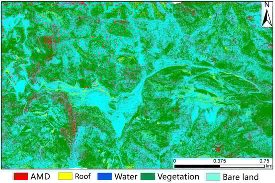 The learning image is an aerial image taken by an unmanned aerial vehicle in the vicinity of the study area, covering an area of 87,680 km2 (Figure 5a). The learning image contains five types of land cover: AMD, roof, water, vegetation, and bare land (Figure 5b). These learning labels are interpreted by human visual interpretation according to the land-use-type map of the mining area. Because the roads in the mining area are non-paved and the surface is consistent with the bare-land type, the bare-land type includes traditional bare land and the roads in the mining area.