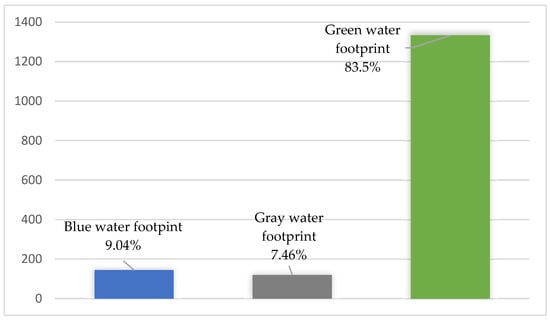 The green water footprint represents the volume of water resulting from precipitation, that accumulates in the plant root zone and is ultimately consumed by the plant, which takes it up from the soil solution and biological growth, respectively, through the process of evapotranspiration []. In short, it represents the volume of water from precipitation consumed for biological processes during the plant production process. In the case of our study, this represents 1333.57 m3 inhabitant−1 year−1, which represents 83.50%, so with the largest share. By category, the highest values are recorded for meat and derived foods (389.77 m3 inhabitant−1 year−1), milk and derived foods (359.95 m3 inhabitant−1 year−1), and grains and derived foods (247.79 m3 inhabitant−1 year−1).