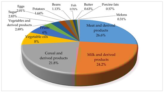 The blue water footprint represents the amount of water that has been used from the surface or groundwater, such as lakes, rivers, and aquifers, and in our case, has been incorporated into an agricultural product [,]. The blue water footprint can refer to irrigated agriculture, water use in secondary processes, domestic water use, and water use in commercial processes. In the case of our study, this represented 144.52 m3 inhabitant−1 year−1, representing a share of 9.04%. It should be noted that in this case, the highest share is recorded in rains and derived foods, with 59.62 m3 inhabitant−1 year−1.