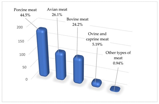 The water footprint of residents’ meat consumption by type is shown in Figure 3. Thus, among the types of meat consumed by Romanian residents, pork contributed the most to the total water footprint of meat consumption, representing 44.5% of the total. This was followed by avian meat with 26.1% and bovine meat with 24.2%.