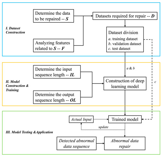 In this research, a framework of drainage system monitoring data repair (DSMDR) is proposed, which can be divided into three parts, as shown in Figure 1.