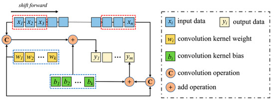 In order to better apply convolution to time series applications, one-dimensional convolution (Conv1D) is used. Conv1D is a convolution operation specially used to process time series data. It has only one spatial dimension, which is more suitable for feature extraction of drainage monitoring data. Conv1D achieves feature extraction by moving a fixed-size sliding window on the input sequence and performing an inner product operation at each window position to generate an output sequence [41]. The process of convolution operation is shown in Figure 2.